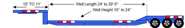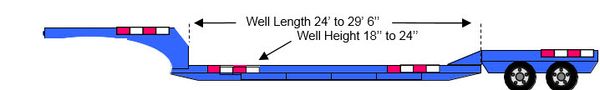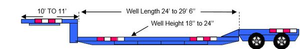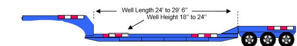 The double drop trailer, designed for excessively tall cargo, generally has a lower deck clearance of 18-22”, which allows the transport of freight up to 11’6”. For roll on roll off freight, a removable gooseneck (RGN) trailer variant is used. The RGN trailer can be unhooked into two sections for easier loading and unloading, and also features a well, generally 29’6” long and 20-24” off the ground, allowing for cargo up to 11’8”.